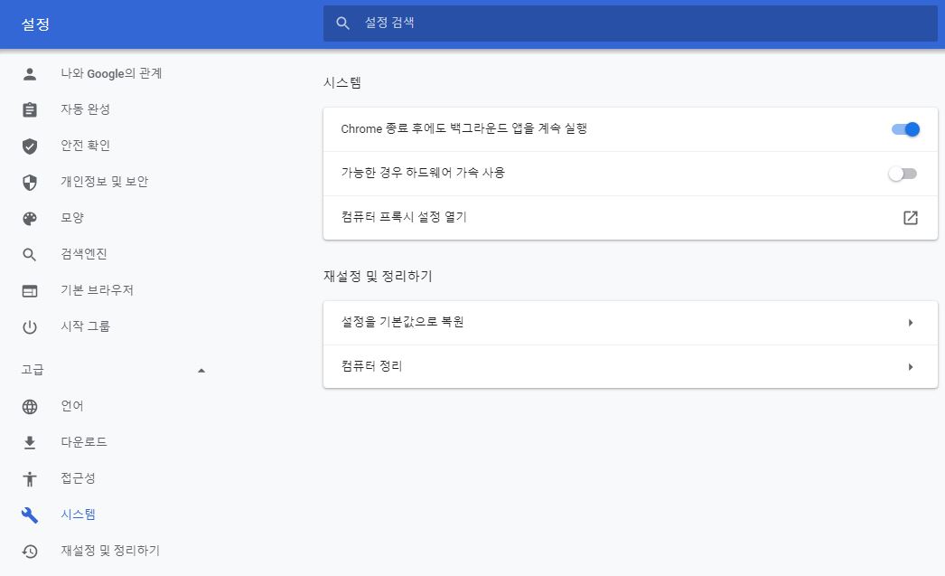 설정 - 시스템 - 가능한 경우 하드웨어 가속 사용 옵션을 끄고 다시 시작 버튼을 누르면 설정이 적용되고