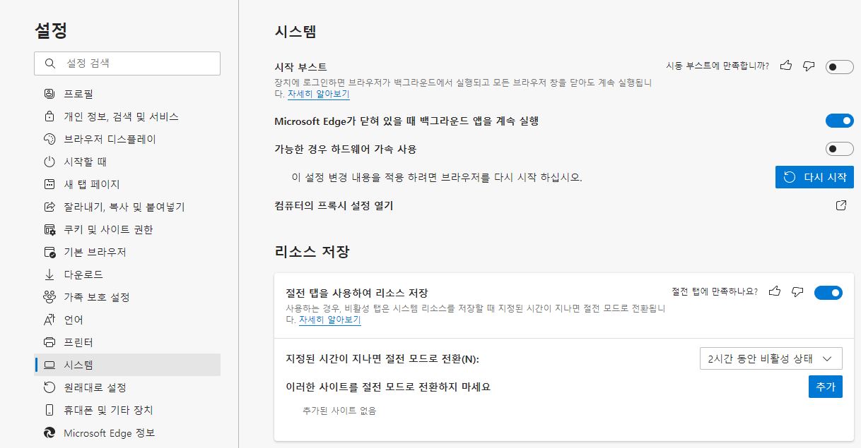 설정 - 시스템 - 가능한 경우 하드웨어 가속 사용 옵션을 끄고 다시 시작 버튼을 누르면 설정이 적용되고